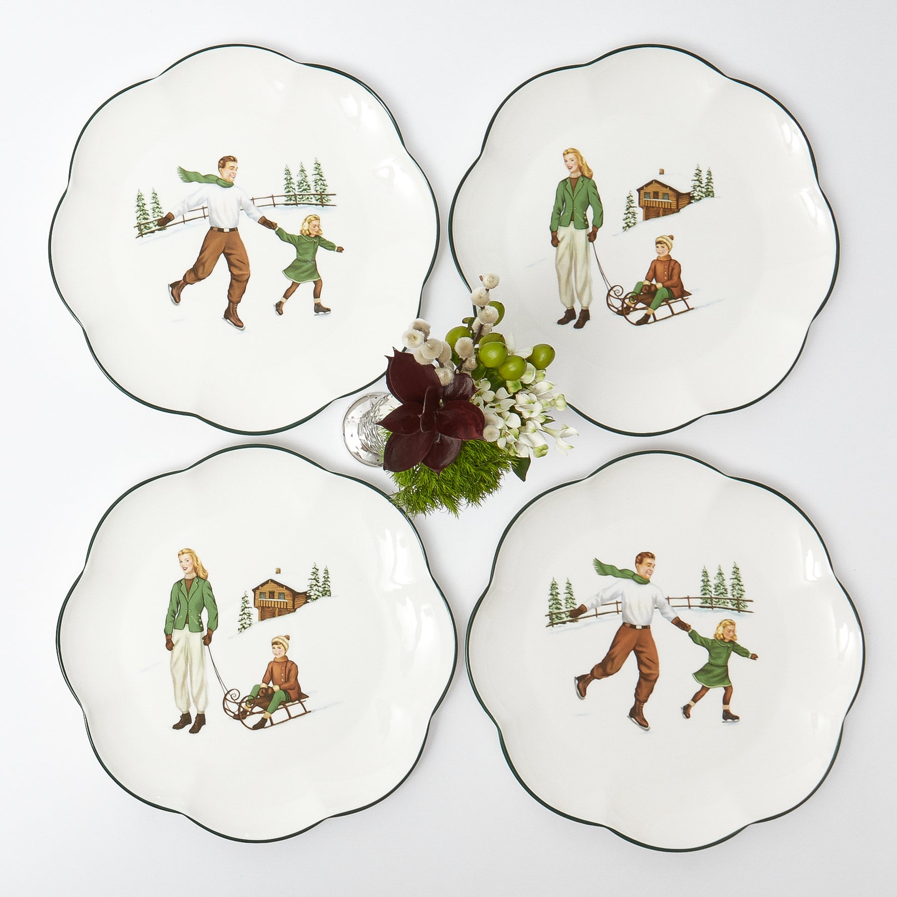 With their fine hand-painted scalloped green rim and unique design, they look lovely with a mountain-inspired palette of forest green, earthy brown, and berry red.