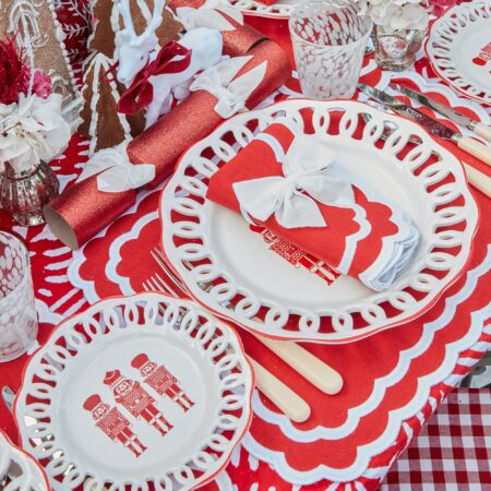 With their fine hand-painted scalloped green rim and unique design, they look lovely with a mountain-inspired palette of forest green, earthy brown, and berry red.
