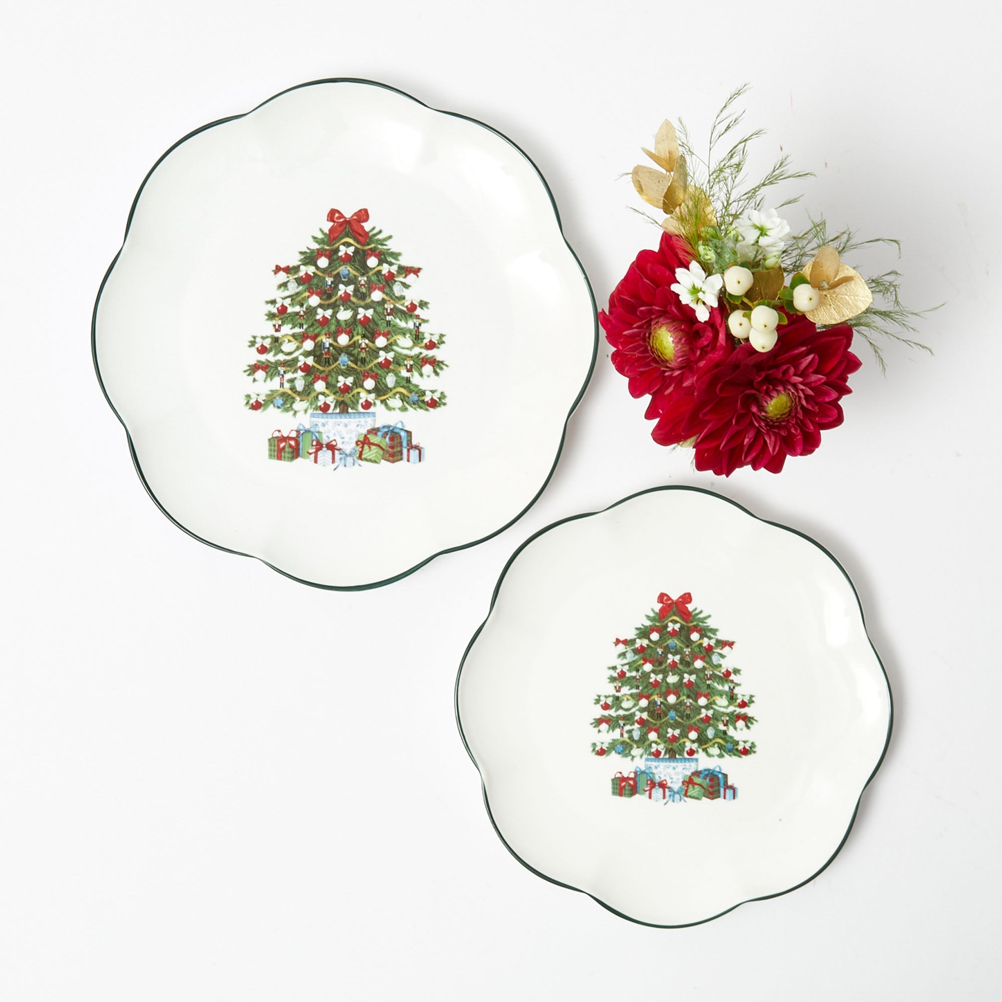 These quintessential festive starter Plates feature an enchanting holiday scene with a Christmas Tree in a chic chinoiserie planter.